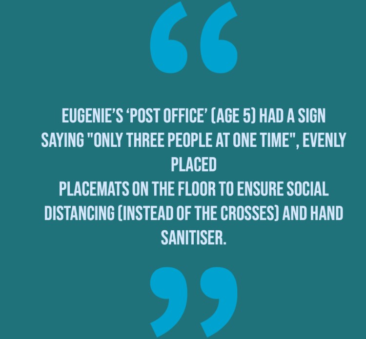 Rainbow on the Pavement“H and H had set up their café open for business, but they needed to keep everyone safe with all the nasty virus germs that are getting around, so they taped off the floor so that the people would stand far enough away. They told me that they had seen tape on the floors in our town and that their mums had explained what it was for.” -Goondiwindi KindergartenCubby house structures constantly being built and re-built in bushland. North-Eastern suburbs of Melbourne, VicPlayers wear masks in RobloxUmbrella cubby, North Melbourne.