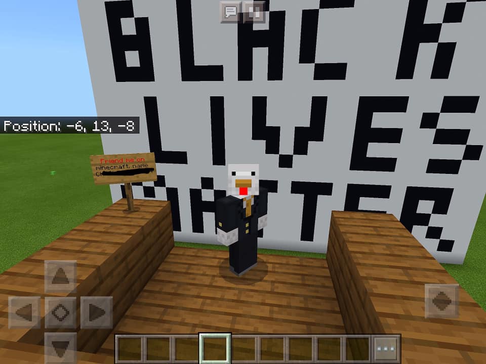 Teddys in the window at Judy’s house“H and H had set up their café open for business, but they needed to keep everyone safe with all the nasty virus germs that are getting around, so they taped off the floor so that the people would stand far enough away. They told me that they had seen tape on the floors in our town and that their mums had explained what it was for.” -Goondiwindi KindergartenCubby house structures constantly being built and re-built in bushland. North-Eastern suburbs of Melbourne, VicBlack Lives Matter banner in Minecraft (Charlie, 9)Percy, 9, Captain Covid.